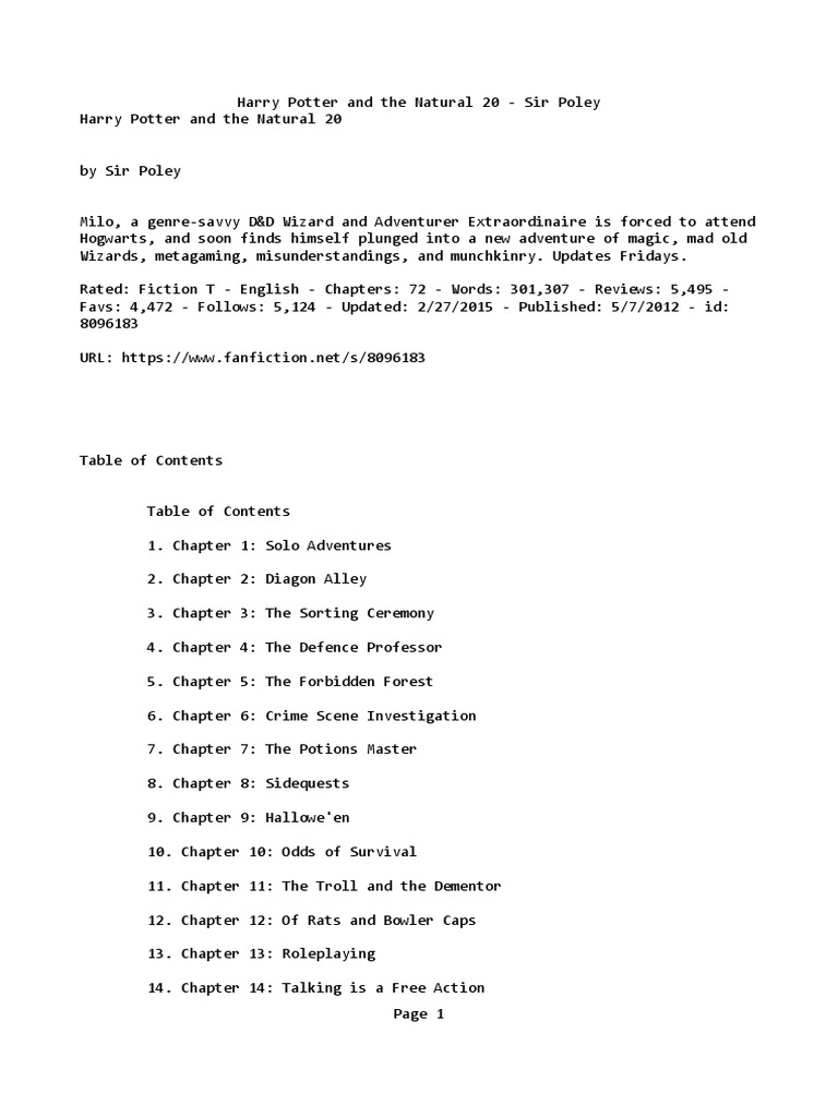 Any free trials valid for new and eligible returning subscribers only. Harry potter and the natural 20 by sir poley is an incomplete crossover fanfic that combines harry potter and dungeons & dragons. Harry potter and the natural 20. This is chapter 2, diagon alley of harry potter and the natural 20 by sir p. Harry potter and the natural 20. If you want to fully download the book online first you need to visit our download link then you must need signup for free trials. Sure, it fires off right as milo is trying to sneak away from a troll, but the fact that. Follow/fav harry potter and the natural 20 by: Less than three weeks into the first term, milo figures out that voldemort is after the philosopher's stone, by savvyness and exploitation of the law of conservation of detail.